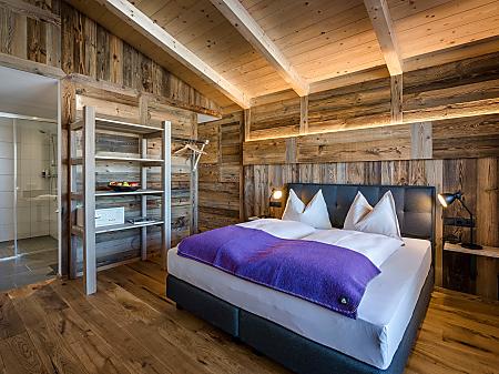 Doppelzimmer in der Adventure Lodge mit Schlafgalerie, Blick auf den Talschluss & die Berge. Kabel TV, WLAN, Dusche, WC, Balkon 1 Doppelbett & 1 Doppelbett in der Galerie, Frühstücksbuffet inklusive, Almlust Spa & Almhallenbad Nutzung, im Winter Skiraum, im Sommer Almsee und Gartenanlage inklusive.