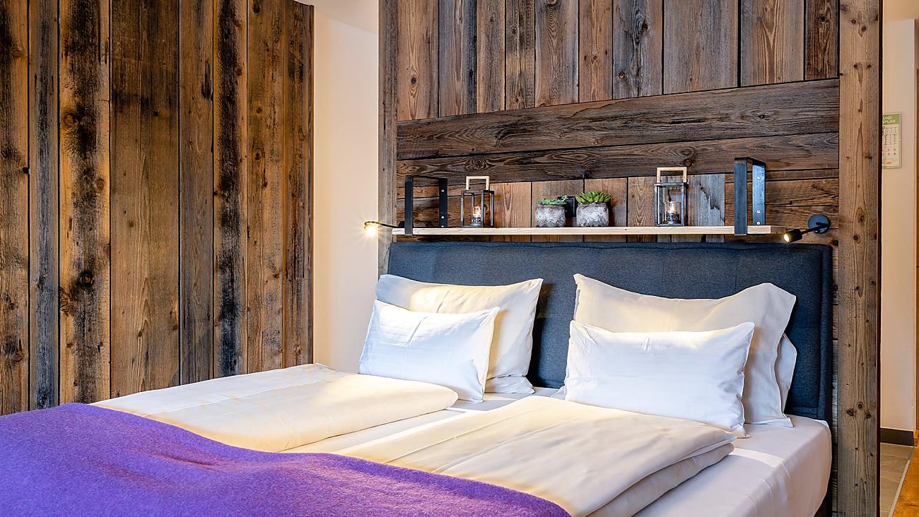 Doppelzimmer in der Adventure Lodge mit Blick auf den Talschluss & die Berge. Kabel TV, Internetanschluss, WLAN, Dusche, WC, Balkon, Hot Pot.1 Doppelbett & die Möglichkeit für 2 Zusatzbetten, Frühstücksbuffet inklusive, Almlust Spa & Almhallenbad Nutzung, im Winter Skiraum, im Sommer Almsee und Gartenanlage inklusive.