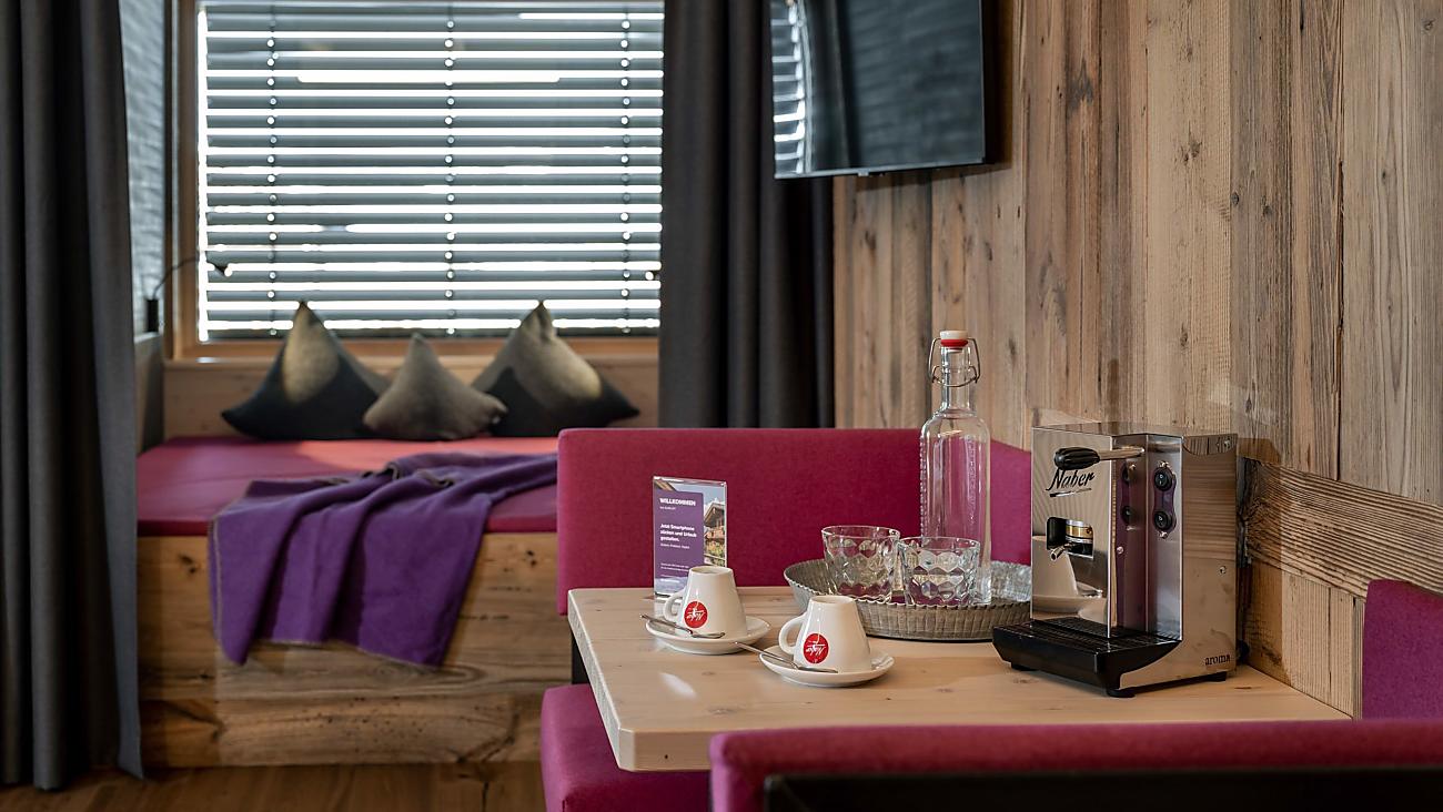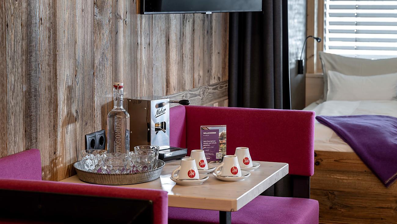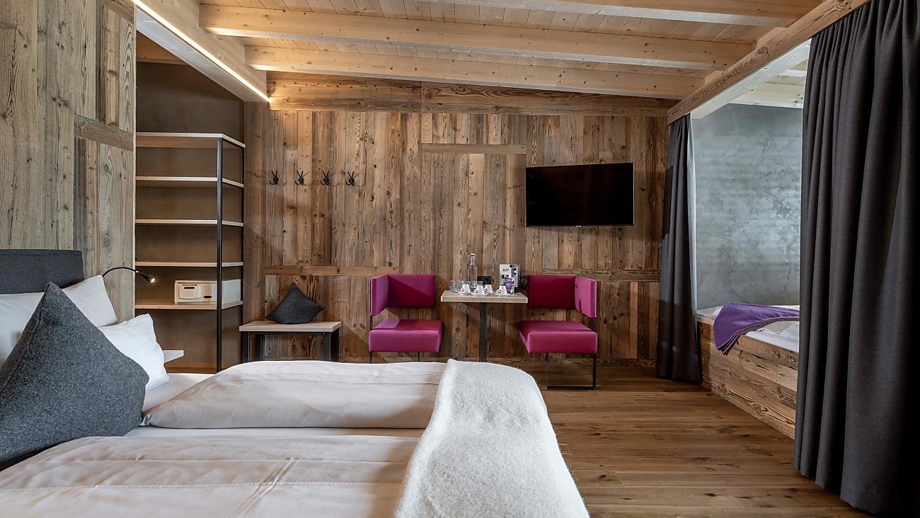 Elegantes Doppelzimmer in der Adventure Lodge mit Blick talauswärts und auf den almlustRock: