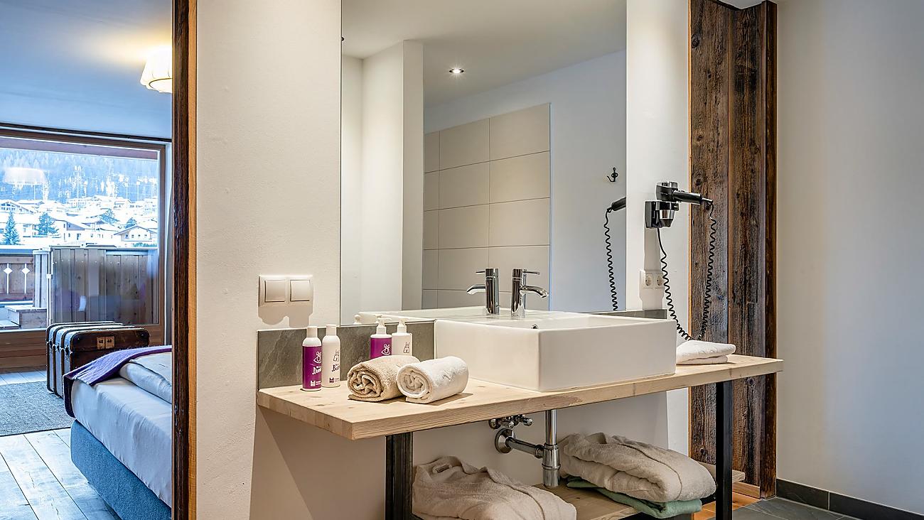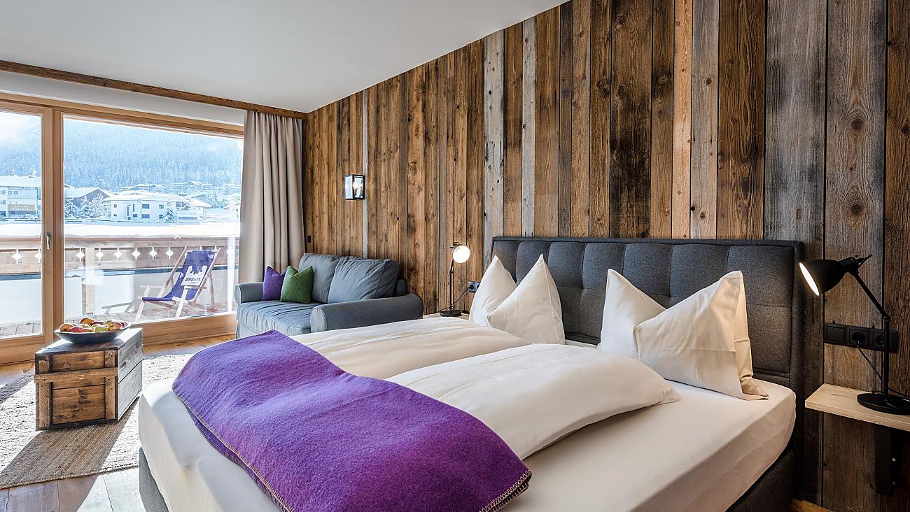 Elegantes Doppelzimmer in der Adventure Lodge mit Blick talauswärts und auf den almlustRock: