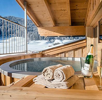 The Almloft impresses with its spacious living area, private south-facing terrace with hot pot, and cozy fireplace – the perfect retreat for families or groups of friends seeking alpine luxury and shared time in style.