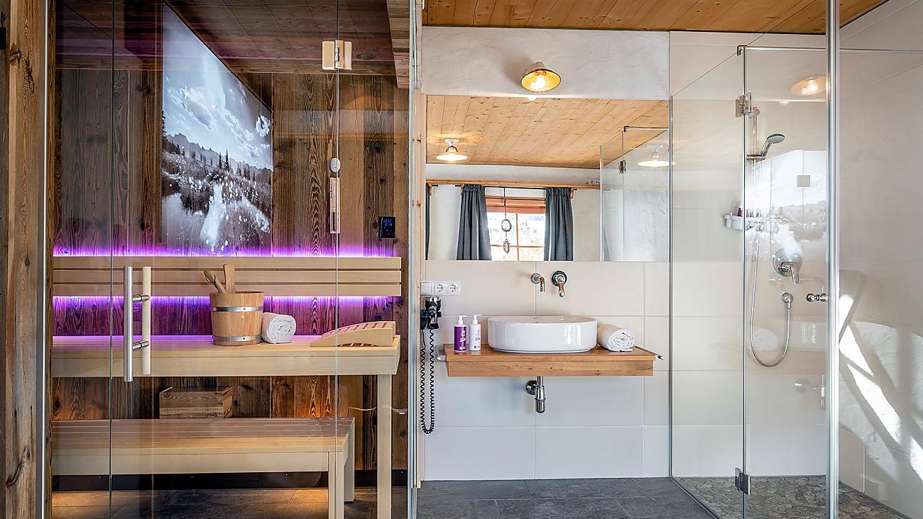 The Almlodge Deluxe delights with its private terrace, wood-fired hot pot, and an exclusive sauna area connected directly to the spacious living room. Alpine charm meets modern comfort – ideal for families or groups of friends looking to relax together.