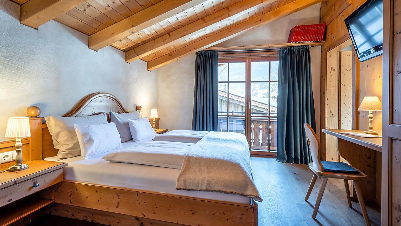 Elegant double room in the Adventure Lodge with a view towards the valley and the almlustRock: