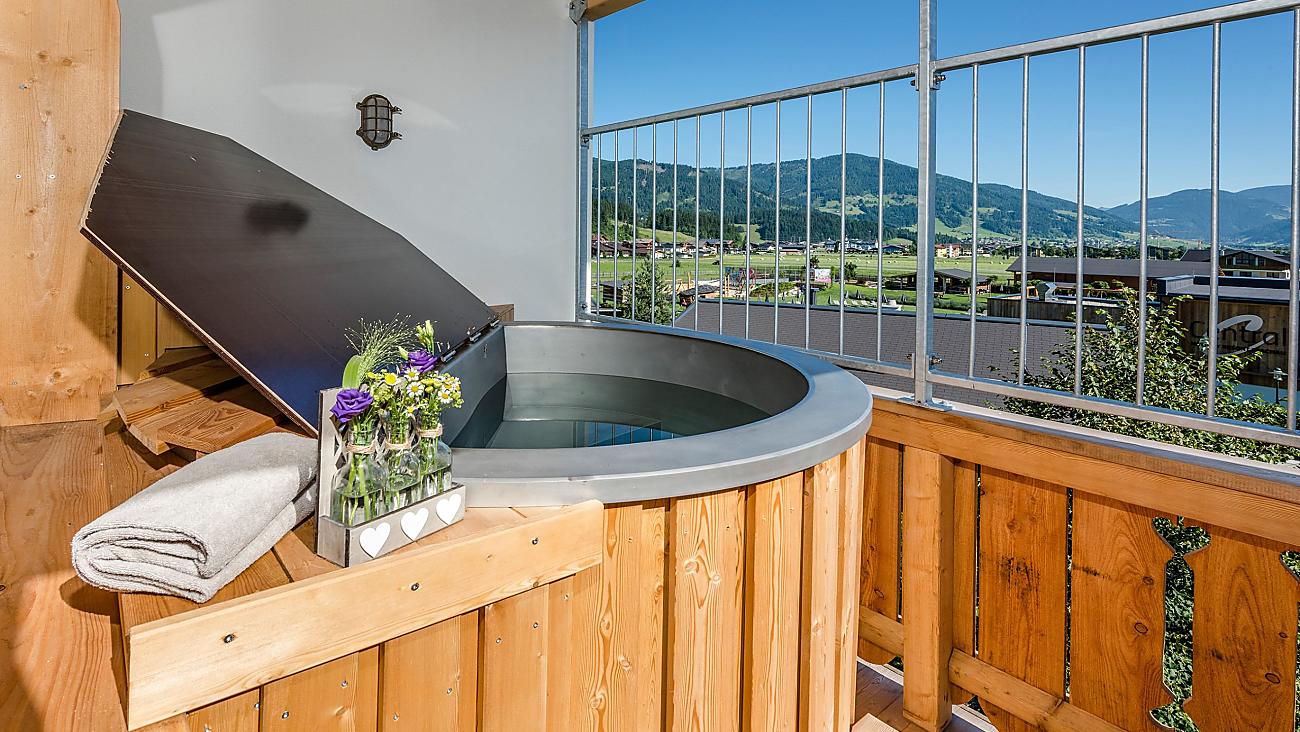 The room features a comfortable box-spring bed, a modern bathroom with shower and WC, and a cozy sitting area with sofa. Up to two extra beds can be added upon request. The south-facing balcony offers sunshine all day long and a spectacular panoramic view of the valley head and the Radstädter Tauern mountains, plus your own private hot pot for ultimate relaxation.