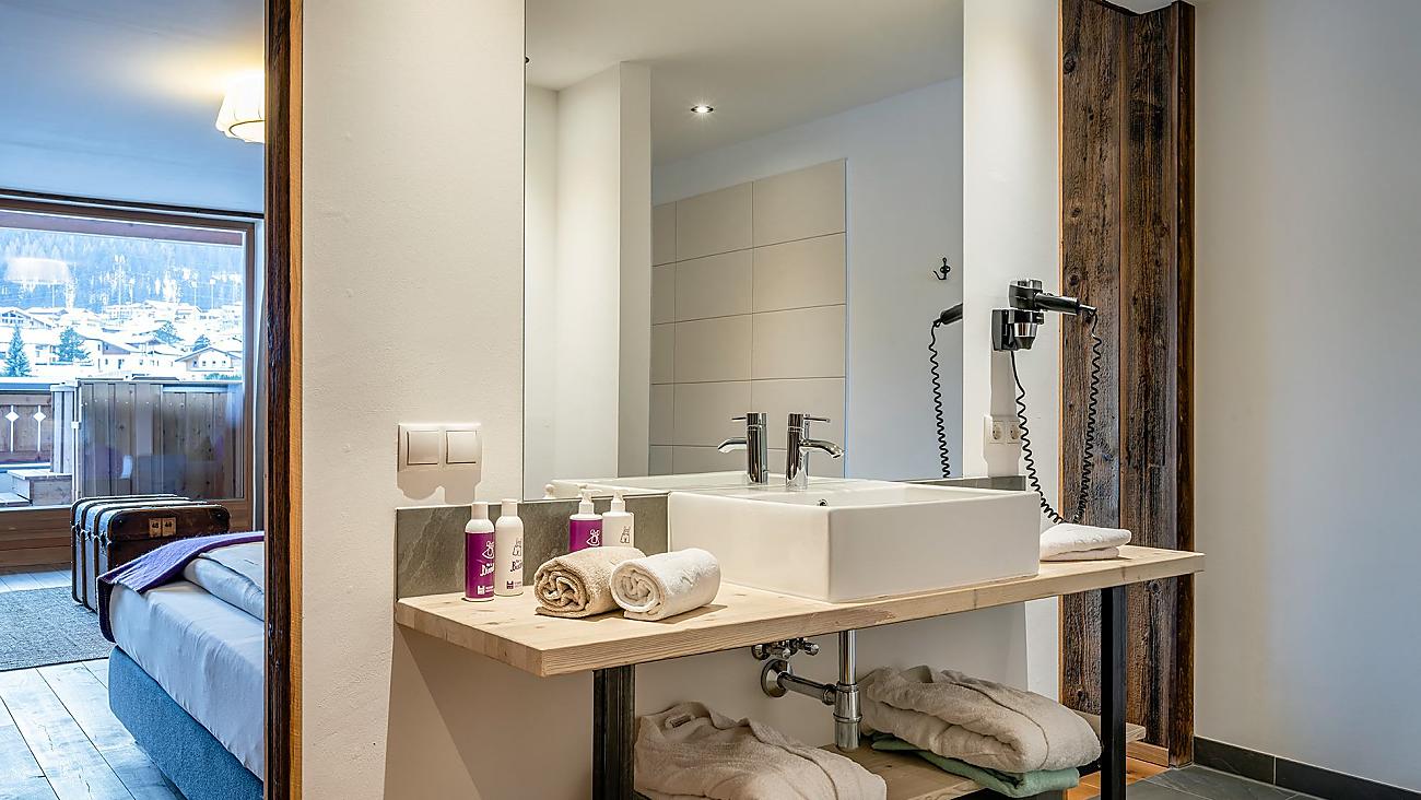 Elegant double room in the Adventure Lodge with a view towards the valley and the almlustRock: