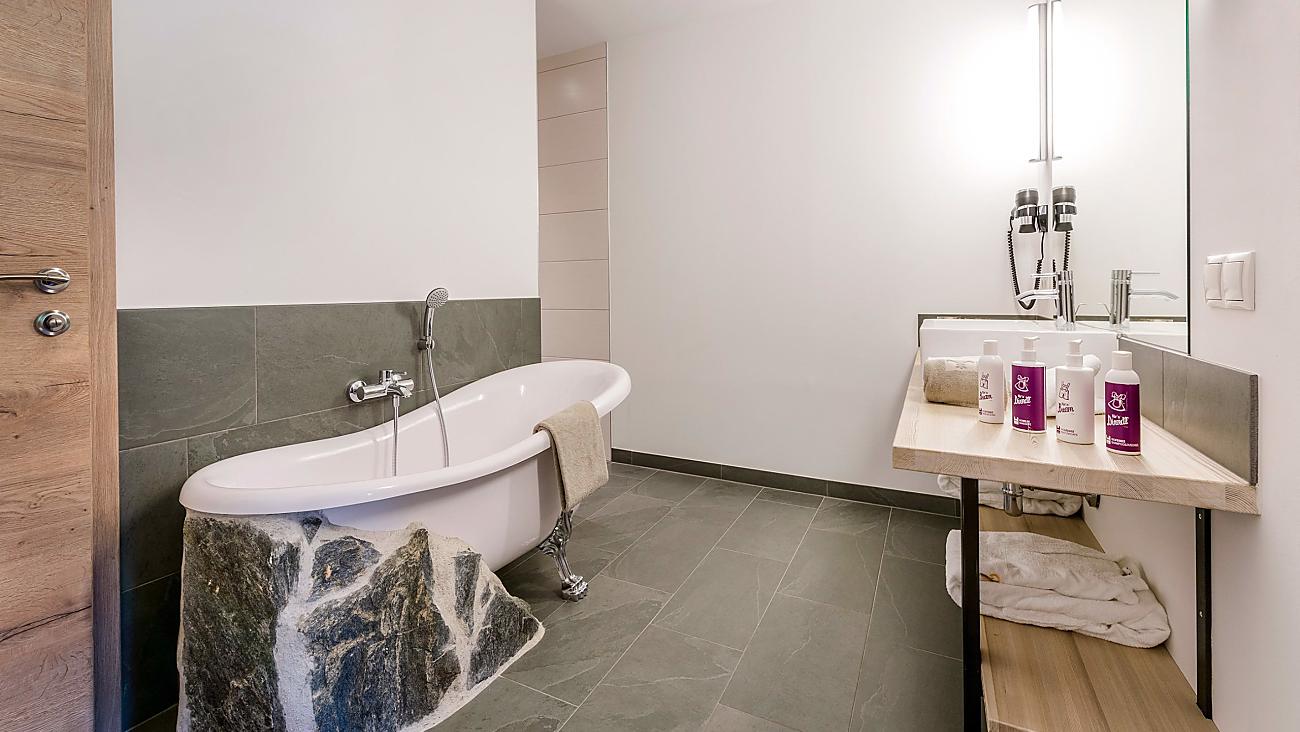 The room features a box-spring bed, a modern bathroom with shower and WC, and – depending on the room type – a freestanding bathtub or a balcony overlooking the garden and the Almlodges. Perfect for those who enjoy smart, cozy, and effortless comfort.