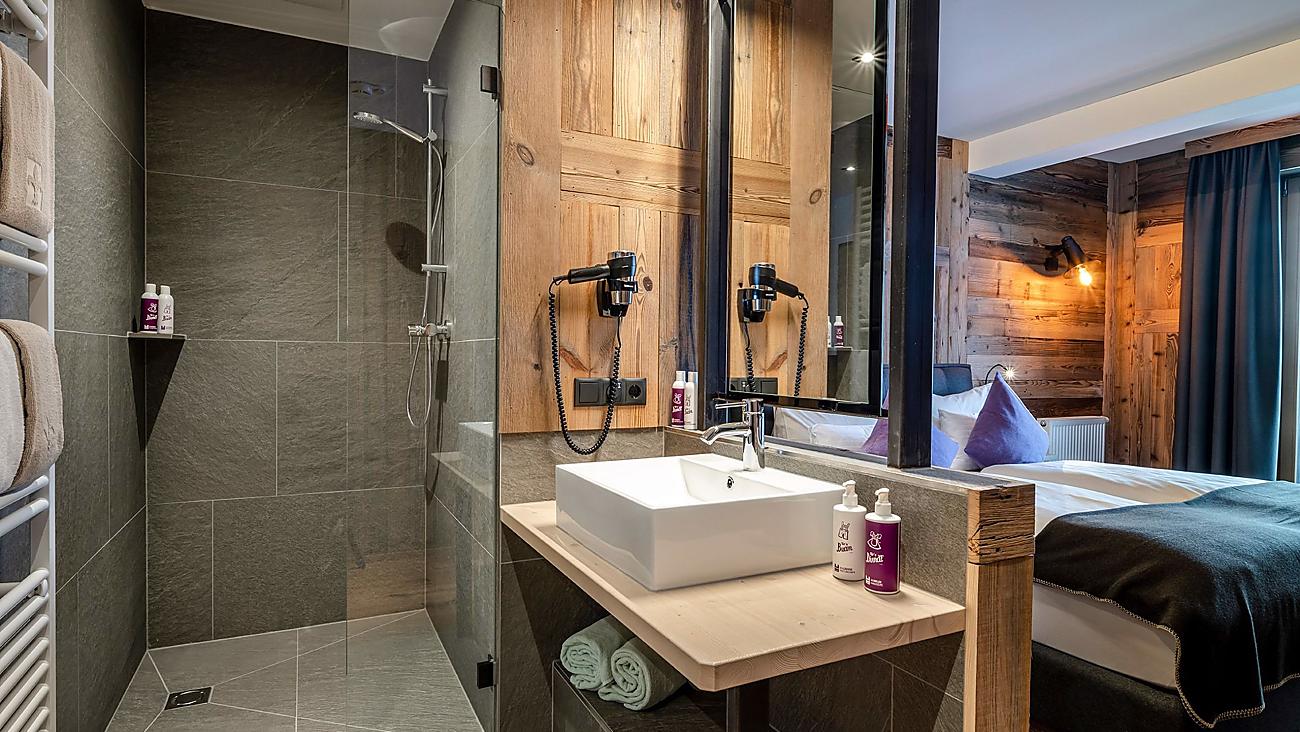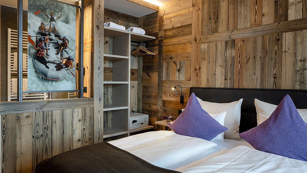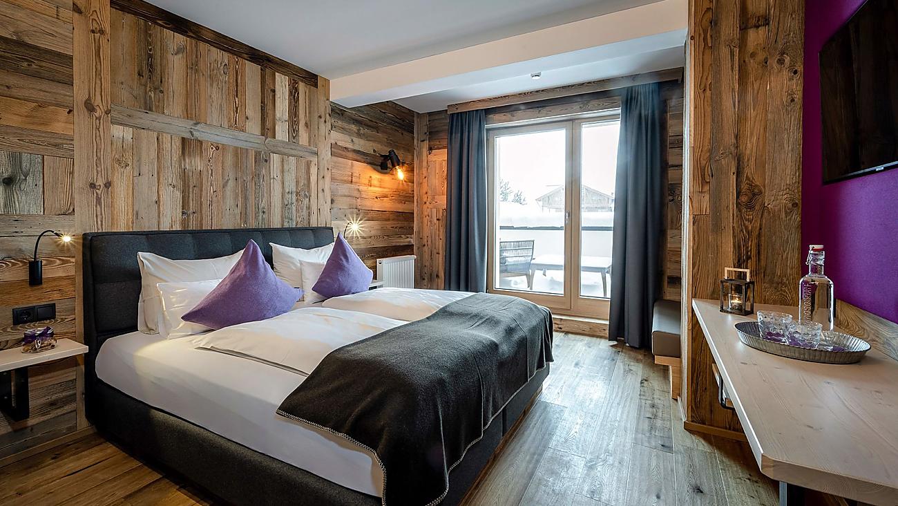 Elegant double room in the Adventure Lodge with a view towards the valley and the almlustRock:
