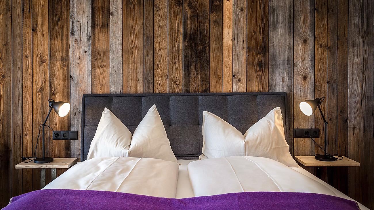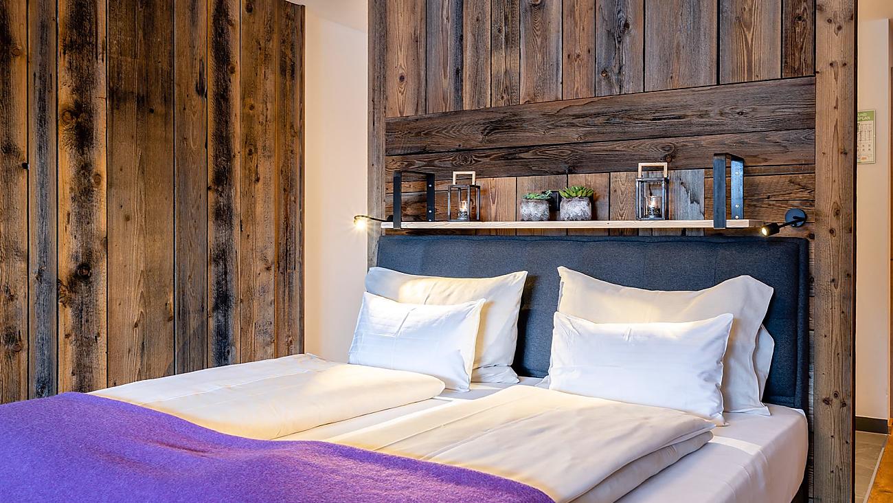 Elegant double room in the Adventure Lodge with a view towards the valley and the almlustRock: