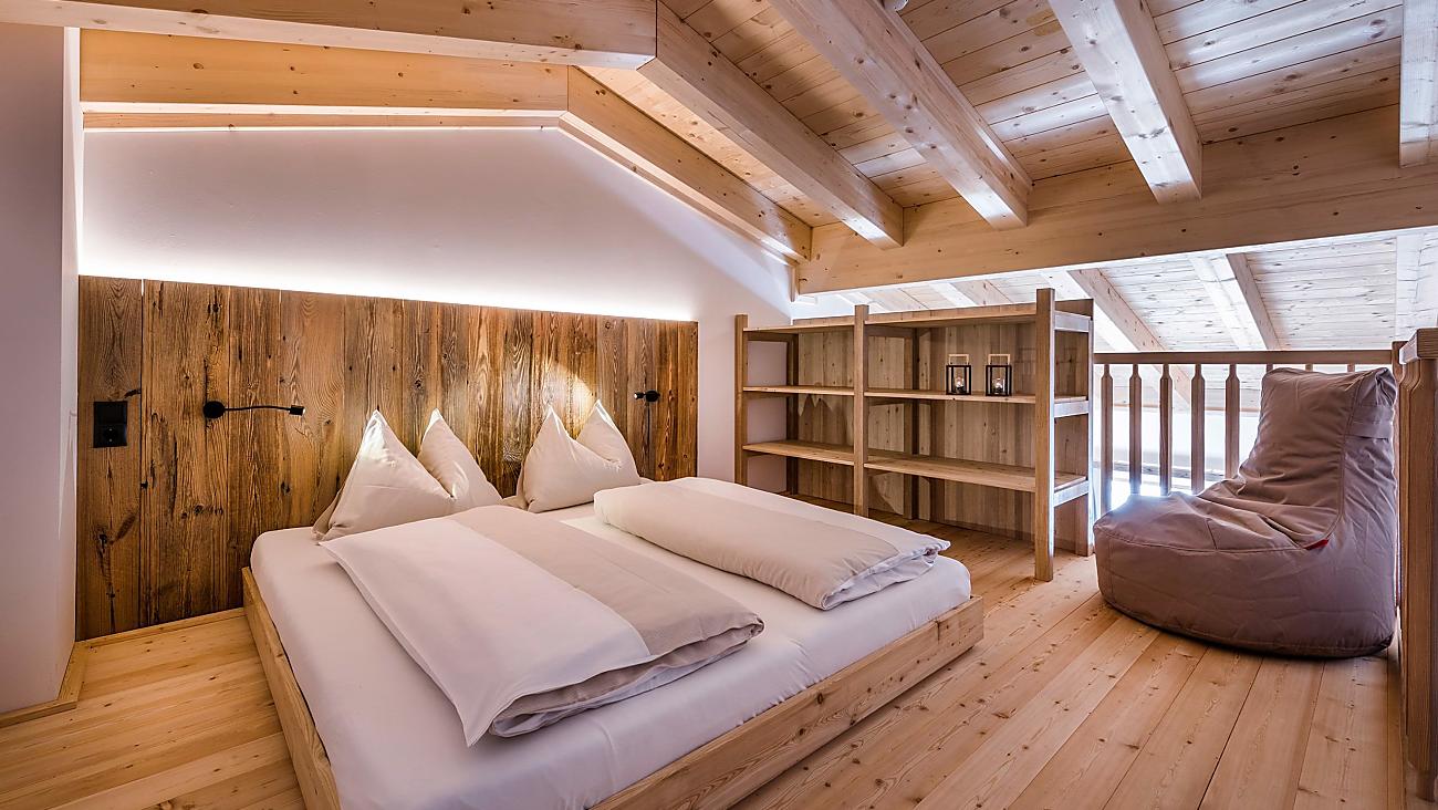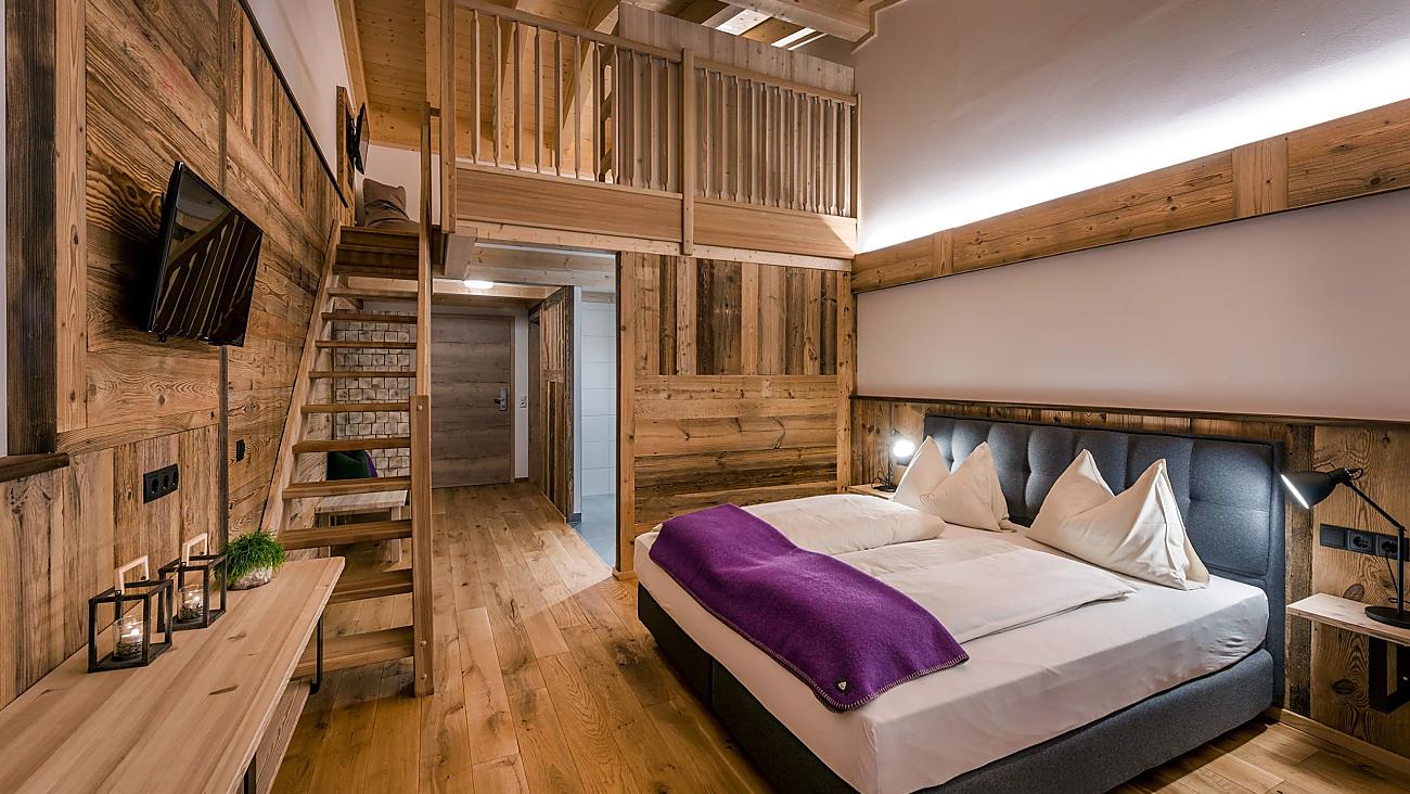 The room features a box-spring bed in the main sleeping area, an open bathroom with shower and WC, and a sleeping gallery with an additional double bed – a highlight for kids or close friends. The south-facing balcony offers sunshine throughout the day and a panoramic view of the valley head and the Radstädter Tauern mountains.