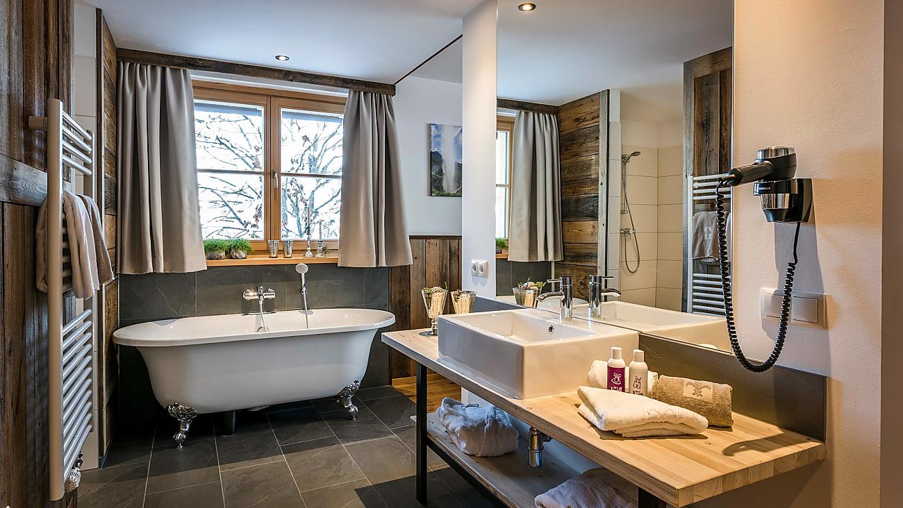 The Almsuite Superior combines alpine charm with modern elegance. Featuring a freestanding bathtub, north-facing balcony, and stylish design, it’s the perfect retreat for couples seeking peace, relaxation, and a touch of alpine romance.
